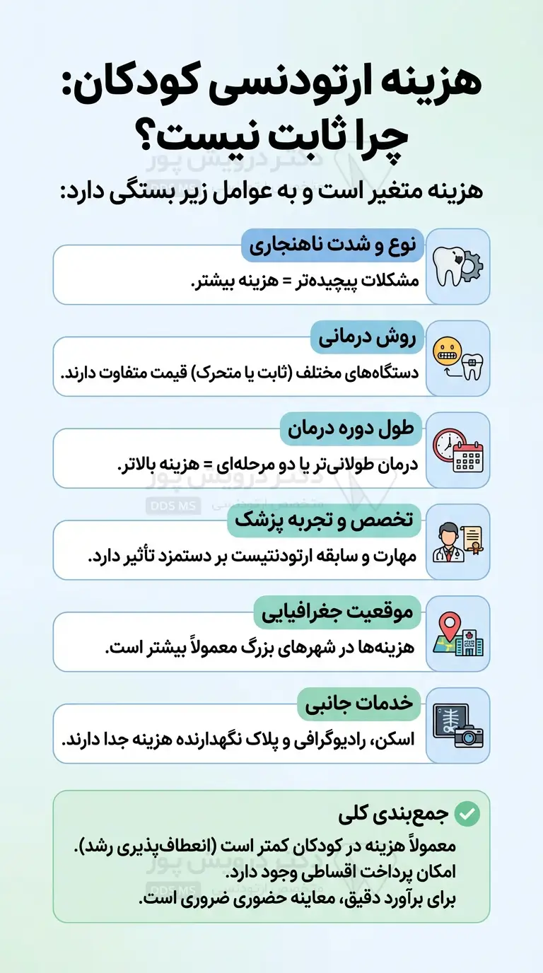 به طور کلی، هزینه ارتودنسی کودکان معمولاً کمتر از بزرگسالان است زیرا فک در سنین رشد انعطاف پذیری بیشتری دارد. بسیاری از کلینیک ها نیز امکان پرداخت اقساطی را فراهم می کنند. برای دریافت یک برآورد دقیق، مراجعه حضوری به متخصص ارتودنسی برای معاینه و مشاوره بهترین راه است.
